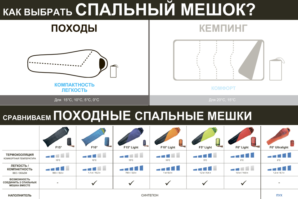 Также существуют полу-коконы и одеяла — промежуточные формы, которые сочетают плюсы обоих вариантов, но их выбор ограничен. Важно выбирать форму спальника в зависимости от предполагаемых температур и личных предпочтений по комфорту во время сна.